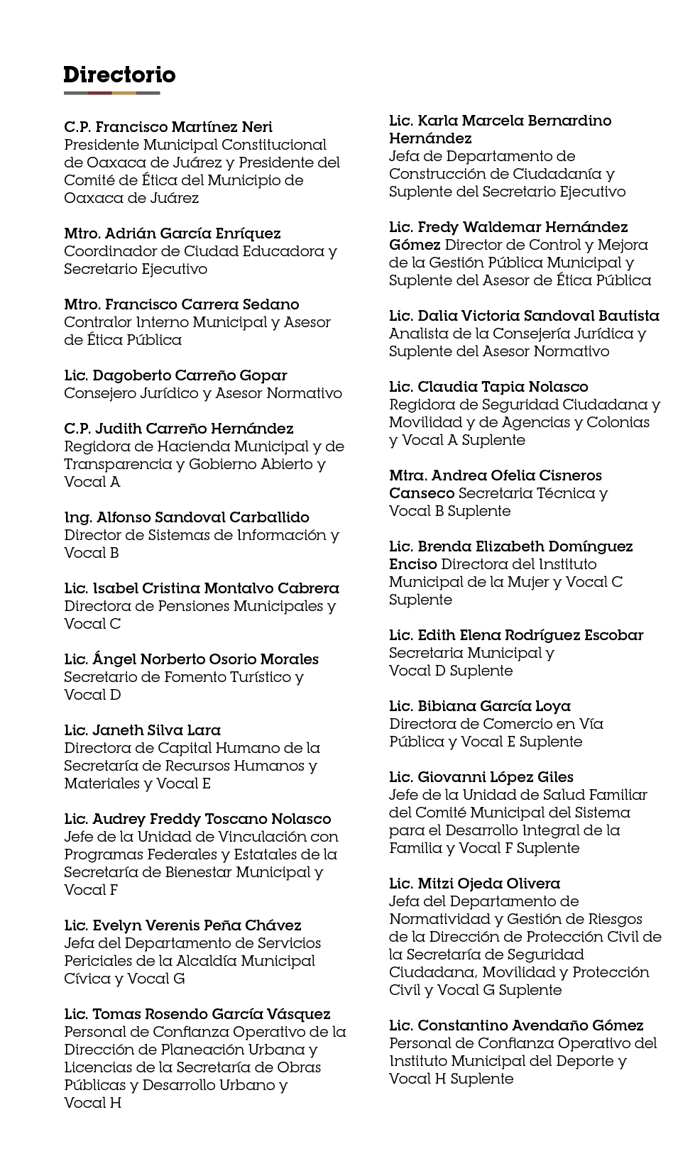 El código de Ética para servidores públicos del municipio de Oaxaca de Juárez establece la necesidad de una administración públicaregida por condictas dignas y respeto a la legalidad...