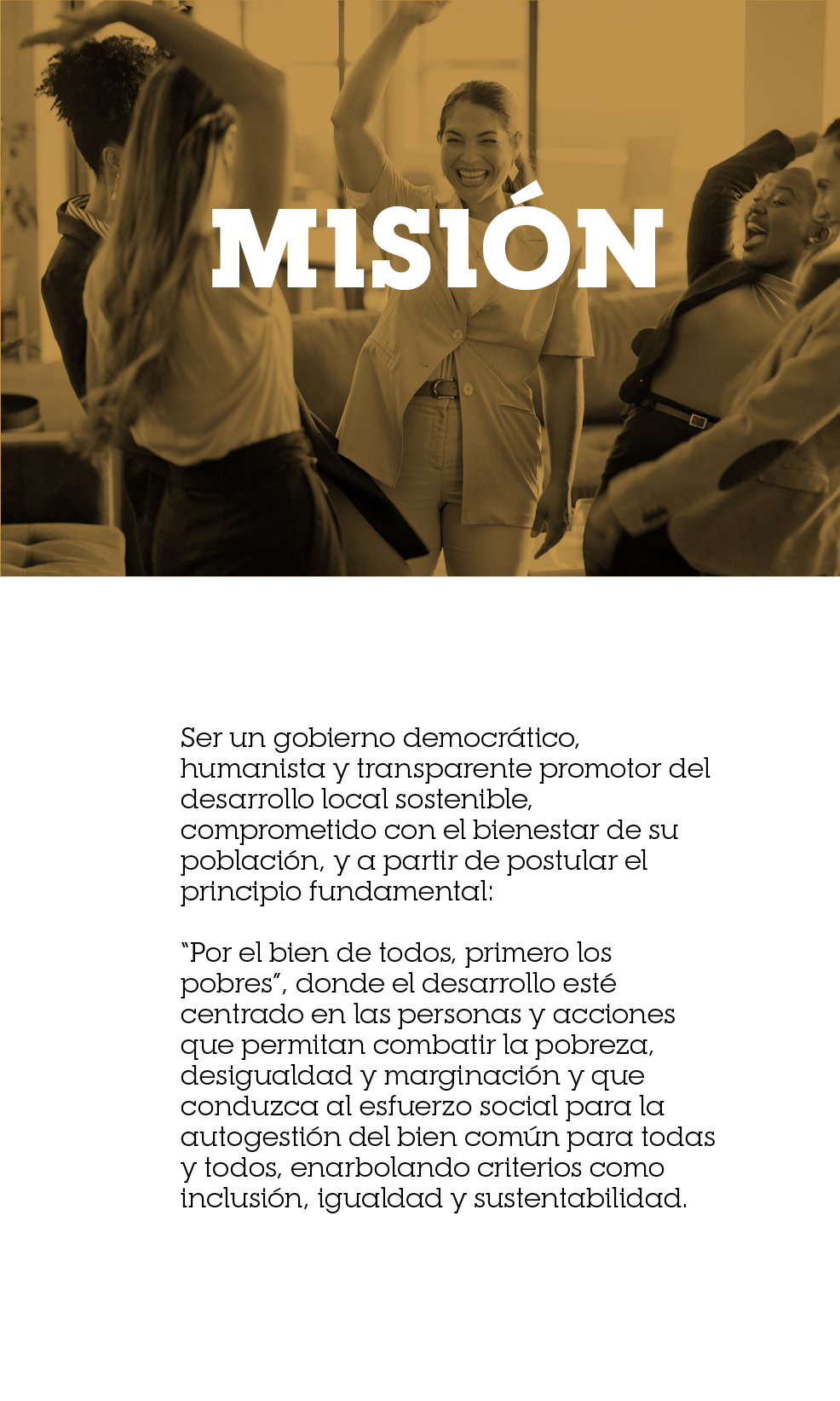 Ser un gobierno democrático, humanista y transparente promotor del desarrollo local sostenible...